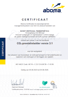 Bij Schot Verticaal Transport zijn kwaliteit en milieu een belangrijk bedrijfsprincipe. Met kwaliteit bedoelen wij ‘klantvriendelijk en veilig’. Met milieu bedoelen wij ‘het beschermen van het milieu’. De CO2-Prestatieladder is een duurzaamheidsintrument dat Schot Verticaal Transport helpt bij het reduceren van CO2 en kosten. Schot Verticaal Transport is gecertificeerd volgens de CO2-prestatieladder op niveau 3. Behorende bij de SKAO (stichting klimaatvriendelijk aanbesteden & ondernemen) www.skao.nl.
